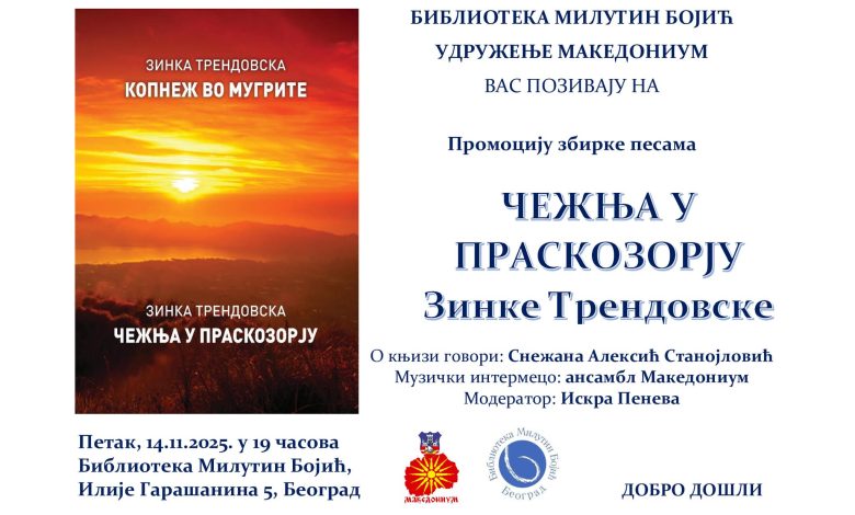 Во Градската библиотека во Белград, на 14 ноември 2025 година, се одржа незаборавна поетска вечер посветена на промоцијата на двојазичната збирка „Копнеж во мугрите“ од македонската авторка Зинка Трендовска. Настанот беше организиран од Здружението Македониум од Белград, а под покровителство на Македонскиот национален совет.