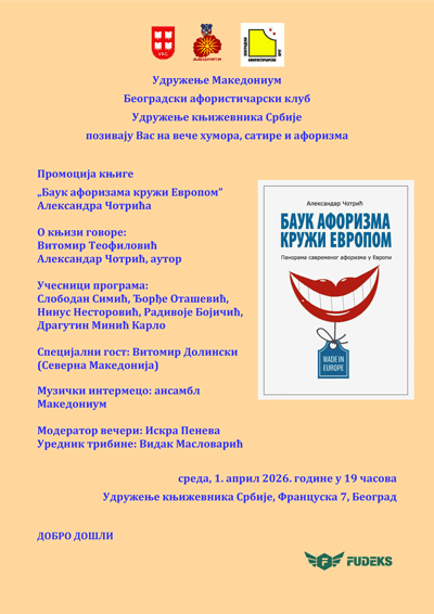 По повод Денот на шегата – 1 Април, здружението „Македониум“, во соработка со Белградскиот афористичарски клуб и Здружението на книжевници на Србија, организираше вечер посветена на хуморот, сатирата и афоризмот, која се одржа во Клубот на писателите на Србија во Белград.